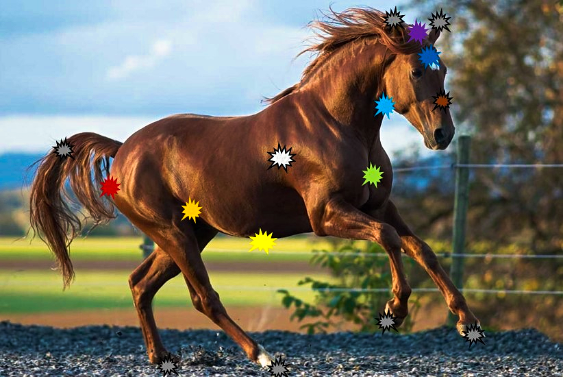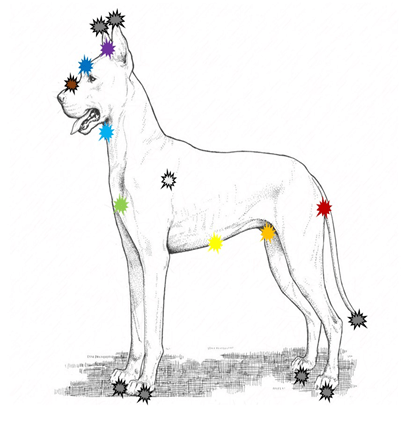 A continuación, encontrarán unas láminas donde se dibuja la localización de los principales chakras en diversas especies animales.